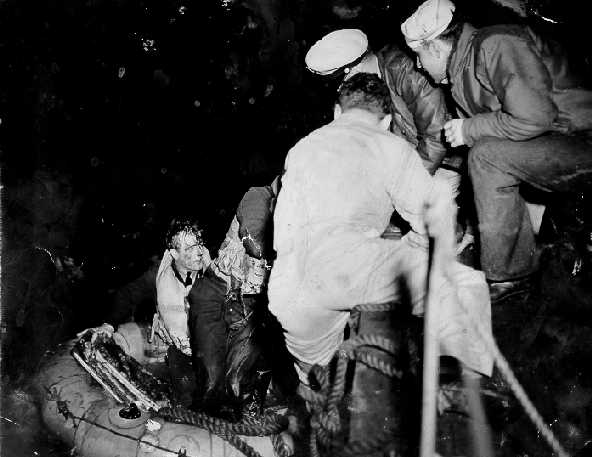 Two RAF flight crew members from a Mosquito bomber that crashed in the English Channel are rescued by the crew of a Coast Guard 83-foot cutter of Coast Guard Rescue Flotilla One.