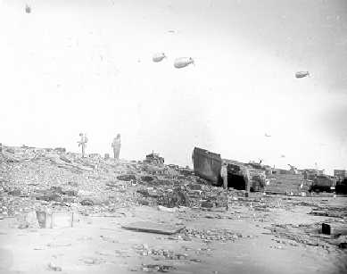 British LCT's line the Normandy shore, each with a barrage balloon designed to discourage enemy air attack.