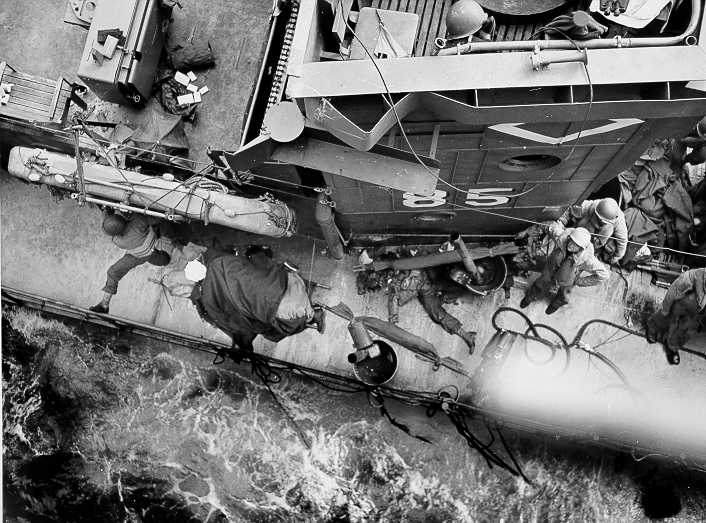 Coast Guard-manned LCI(L)-85 during a practice landing at Slapton Sands. The "85" would be pummeled by enemy fire during the invasion and sank in the English Channel on D-Day.